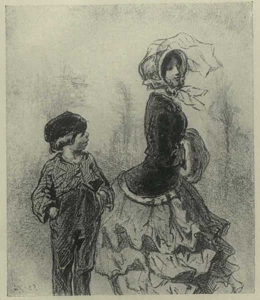 Théophile Alexandre Steinlen made this lithograph, Premiere Armes, on paper at an unknown date. It depicts a young uniformed soldier offering a cigarette to a fashionable woman. Steinlen's image invites us to consider the cultural expectations of gender and class in France at the turn of the 20th century. The soldier, just beginning his military service, extends a gesture that might be interpreted as flirtatious or merely polite, but either way the act reinforces social hierarchies. We can imagine him learning to perform his masculinity, perhaps awkwardly, while she, with her hat and parasol, embodies the bourgeois elegance of the era. We might investigate how the military and gender roles were represented in popular culture at that time, perhaps by consulting periodicals, posters, and other printed ephemera. How did the rise of mass media shape social attitudes, and how did artists like Steinlen engage with these shifting norms? The historian's role is to uncover the complex interplay between art, culture, and society, revealing the hidden meanings embedded within seemingly simple images.