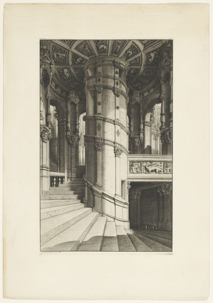 This is "Bibliotheek en rariteitenkabinet," a drawing by Balthasar Sigmund Setletzky made sometime before his death in 1771. The artist’s use of perspective lines and shading gives a sense of depth, inviting the viewer into the library's grand, almost theatrical space. The drawing's composition hinges on the contrast between the architectural structure of the library, with its ordered rows of books and the hint of a domed ceiling, and the asymmetry introduced by the slightly opened door. This detail disrupts the formal balance, offering a glimpse into another space. The detailed rendering of the bookshelves and ornaments suggests an interest in the Enlightenment's focus on knowledge. At the same time, the disruption of symmetry with the open door subtly questions the completeness of the rational ordering system. The viewer is left to wonder what lies beyond the ordered space of the library.