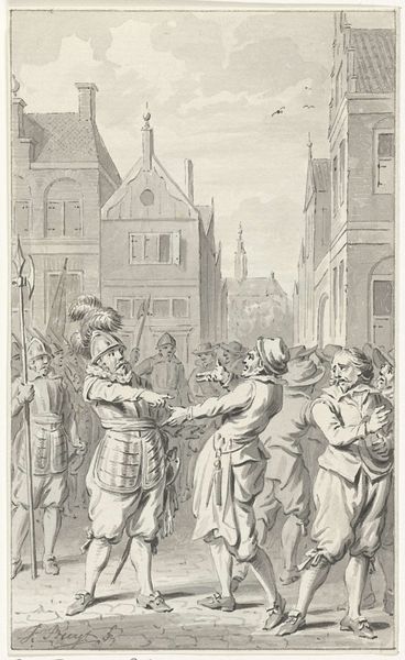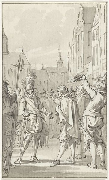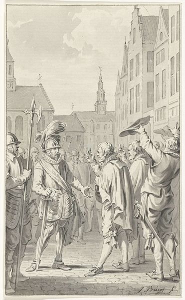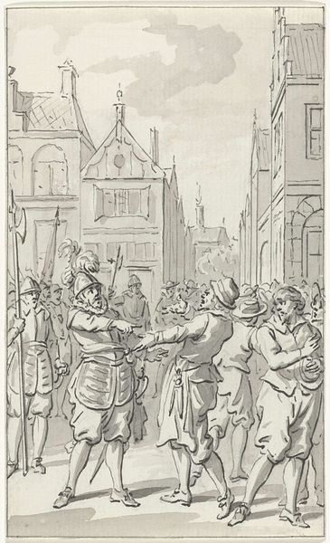 Editor: Here we have Jacobus Buys’s drawing, created between 1778 and 1795, titled 'Jan de Bakker, priester te Woerden, op het Binnenhof te Den Haag wegens ketterij gewurgd en verbrand, 1525.' It depicts the execution of a priest, using pencil and ink. The somber monochromatic tones definitely set a serious, heavy mood. What strikes you about the composition? Curator: The arrangement presents a clear division, focusing on the priest at the center and the architecture of the Binnenhof as a rigid backdrop. Notice the linear quality achieved through the precise rendering of architectural details, contrasted with the softer treatment of the crowd. This juxtaposition amplifies the central drama. The limited tonal range further unifies the scene, emphasizing its somber affect. Editor: So, it’s less about the individual people and more about the event and the setting itself? Curator: Precisely. The architecture acts almost as a stage. How do you perceive the relationship between foreground and background in establishing a sense of space and narrative? Editor: I see, the darkness and heaviness in the foreground does kind of overshadow the background architecture, emphasizing the main scene in the center stage. Curator: Precisely. The emphasis is on the here and now, the stark reality of the execution. The architecture looms, yet it's secondary to the grim scene unfolding before us. What have you gained from closely observing this image? Editor: I now see how the composition and monochrome scheme contribute to the drawing's meaning and affect. Thank you for elucidating it. Curator: And I was also pleased to further hone my understanding and insight into it by dissecting the artwork with you!