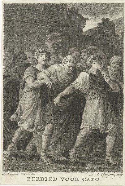 Curator: This print is entitled "Seianus redt Tiberius," made in 1803 by Ludwig Gottlieb Portman. The work is currently held in the collection of the Rijksmuseum. It's a captivating engraving rendered in the neoclassical style. Editor: My first impression is tension, thick with a sense of impending doom. Look at those raised hands, the startled expressions… Curator: Portman portrays a pivotal moment. Lucius Aelius Seianus, commander of the Roman Praetorian Guard, is credited with saving Emperor Tiberius from a collapsing grotto. What might the iconography reveal? Editor: Consider the garland of laurel draped precariously above. Laurel, the symbol of victory and imperial power, is threatened, mirroring the vulnerability of Tiberius himself. The fire might represent chaos, or perhaps even divine judgment. Curator: I wonder if we can also consider this image as reflective of its own era? The Neoclassical movement drew heavily from the Roman Republic and Empire for models of civic virtue but was equally adept at subtly commenting on contemporary events, like, say, Napoleon’s imperial ambitions. Editor: That's insightful. Viewing Sejanus' act through a contemporary lens makes it interesting. Was Portman trying to warn his contemporaries about unchecked ambition disguised as saviorism? Curator: It is a fascinating thought, especially since we now know how Sejanus's own ambition would bring him down when he tried to overthrow Tiberius years later! Power always exists within a specific set of power structures. Editor: And here we see it visualized so explicitly, with symbolism and storytelling that speaks across the centuries. A constant reminder of the drama and complexities that can be conveyed by something as seemingly simple as an image.