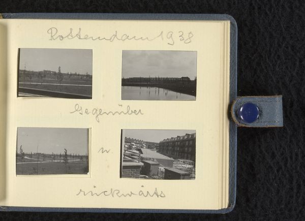 This is “Kwartier in Buschhoven,” an anonymous photograph, or rather a collection of three, pasted into an album. The thing that grabs me is how these images, probably shot with a simple camera, become almost abstract studies. It's all about light and shadow, a wintery world distilled into grayscale tones. The snow-covered buildings become blocks of white, sharply contrasted against the dark skies and fields, simplifying shapes. Look at the central photo. The barbed wire fence in the foreground creates these amazing horizontal lines. They cut through the space, drawing your eye towards the distant buildings, and the soft, snow-covered fields. It's this back and forth, between near and far, dark and light, that gives the image such depth. This piece reminds me of Bernd and Hilla Becher, in the way it captures the beauty of everyday structures. But here, there’s also a touch of something else: a quiet, almost melancholic feeling. It invites you to slow down, and to really see the world around you.
