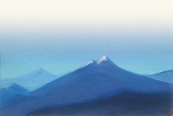 Editor: This is Nicholas Roerich's watercolor, "Himalayas. Ridge Kanchendganga." The cool blues and hazy whites create a feeling of vastness, but also a sense of something hidden. What symbolic weight do you think the mountains carry here? Curator: Mountains, especially the Himalayas, often represent spiritual aspiration, enlightenment, and transcendence across cultures. Roerich, with his deep interest in Theosophy and Eastern philosophies, certainly draws upon this symbolic language. Consider the upward thrust of the peaks. What might that suggest? Editor: Perhaps a striving towards something higher, like spiritual growth? The colours also contribute, don't they? That ethereal blue. Curator: Precisely. Blue is linked to the heavens, to spirituality, to the infinite. But look closer at how Roerich applies the watercolor. The peaks are almost geometric. This stylized representation echoes ancient iconographic traditions. Roerich’s paintings acted as visual mantras, intending to instill certain cultural values to encourage viewers toward a deeper understanding of universal harmony. Does it trigger something in you? Editor: I can definitely see that, the way they almost stack up into the distance. And the hazy style definitely hints at that, since the exactness of shapes and dimensions are replaced with a symbolic form of them. Is that why the exact year the piece was made is missing? It wasn't about specificity of date. Curator: Indeed! Time almost becomes irrelevant in the face of such eternal forms. He evokes a cultural memory, connecting viewers to a longer history of reverence for the sacred mountain. What feelings does that provoke? Editor: It really does evoke a sense of timelessness and connects something inside. Thanks! I’ll look at his work with that context from now on! Curator: Exactly! The language of symbols provides access to understanding, and an enduring resonance across generations.