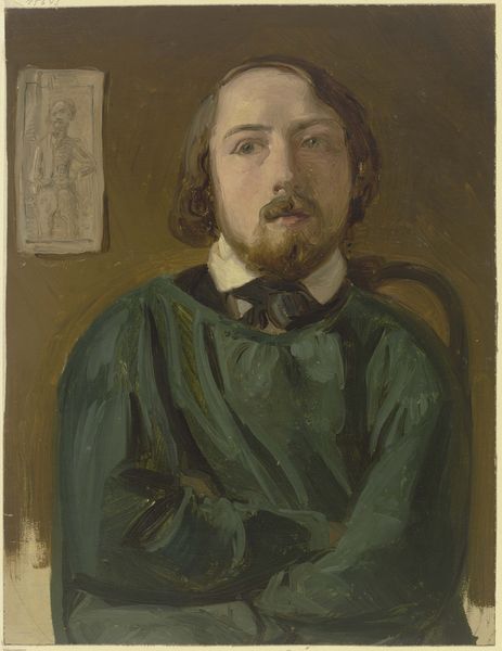 Editor: This is John Peter Russell’s portrait of Fabián de Castro. What strikes me most is the composition, particularly the way the subject blends into the decorative background. What do you see in this piece? Curator: The brushstrokes themselves command attention. Notice how Russell employs short, broken strokes, building texture and form with pure color. Observe the interplay between the figure's form and the background. The artist's intention seems less about representation and more about exploring visual relationships through color and texture. How does this resonate with you? Editor: I agree, the flatness almost abstracts the figure. I hadn’t considered the intention behind that. Thank you! Curator: Indeed. A close analysis of form, color, and materiality reveals the artist's aesthetic project.