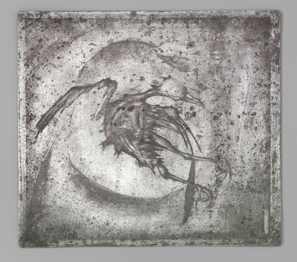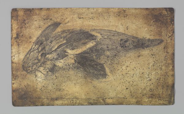 Curator: "Dode Vogel," or "Dead Bird," a graphite and watercolor drawing by Jan Petrus Ponstijn, created sometime between 1940 and 1948. Editor: What strikes me immediately is the overwhelming feeling of quiet stillness emanating from such delicate rendering. Curator: Note how Ponstijn's masterful use of monochrome adds depth. See how he builds volume and weight with varied textures rather than color to focus on line and form. Editor: Indeed. The dead bird itself, rendered in somber greys, acts as a potent emblem, don’t you think? Birds so often signify freedom, flight, even the soul. Here, that symbolism is inverted—its a stark memento mori. Curator: Interesting. Look at the formal relationship between the bird's body and the negative space surrounding it. The rigid rectangular composition perfectly constrains the organic shape of the fallen bird. Editor: It reminds us of how we, too, are constrained, ultimately. Perhaps the work points towards the anxieties and uncertainties of the wartime era. A fallen symbol perhaps reflecting human vulnerabilities and death during wartime? Curator: We cannot ignore the material decay either: there's a compelling tension between realism and the ravages of decomposition visible in the textural layers within. Editor: Ponstijn has undeniably crafted an image pregnant with historical context through a subject we find instinctively, perhaps universally, affecting. Curator: Ultimately, Ponstijn offers a study on light and shade and an exercise in representational aesthetics. Editor: Agreed. It serves to remind us about universal themes like mortality through this potent iconography.