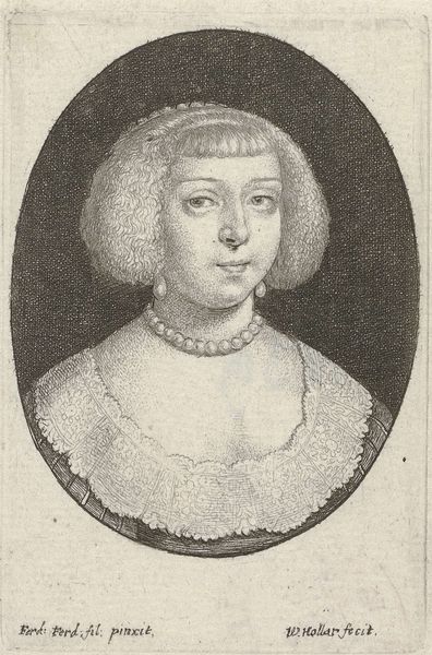 Curator: This is "Woman with large circular fur hat and lace ruff," an engraving dating back to 1645, created by Wenceslaus Hollar. The work, a wonderful example of Baroque portraiture, now resides here at the Metropolitan Museum of Art. Editor: The sheer size of that fur hat is astounding! It's almost a halo, dwarfing the woman's face. There's a visual language here of status and almost cartoonish level of wealth. Curator: Exactly! These visual cues were very intentional. Hollar was operating in a context where images, particularly prints, were powerful tools for constructing and disseminating identities. This portrait, most likely commissioned, functioned as a kind of social advertisement. Editor: And what about the symbols beyond the obvious wealth display? That lace ruff, for instance, is incredibly detailed. Curator: Lace, during this period, held tremendous significance. It was expensive and complex to produce, signifying both refinement and status. Think of it as a visible demonstration of intricate social structures and economic power. It mirrors how art institutions operate. Editor: Right! And what of her almost unnaturally smooth skin, a blank canvas face contrasting so strikingly with the elaborate textures of fur and lace. What is she hoping to communicate? Curator: That's a question deeply rooted in Baroque aesthetics. Think about the public persona—what’s revealed versus what is strategically concealed. Hollar was active during tumultuous political periods; and portraits of wealthy noble families were created to portray continuity of family line during those uncertain times. Editor: I find it so interesting to realize that this portrait operates both as an aesthetic artifact and historical evidence. Symbols truly create unique windows into the past. Curator: Indeed, and with the help of dedicated museum spaces and curatorial decisions, our understanding of their power only becomes deeper through the centuries. Editor: Well, it certainly makes you wonder about the stories hidden beneath the fur and lace, and if only the portrait could reveal it’s story.