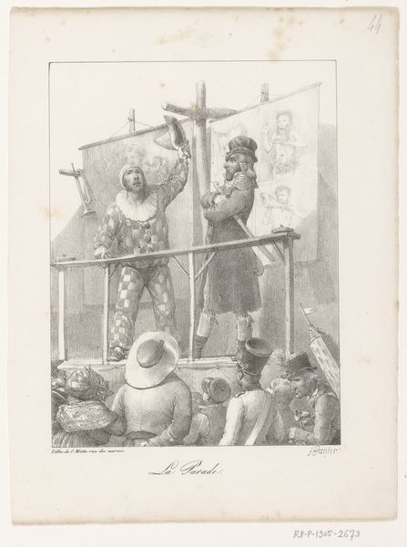 Curator: Ah, there it is! This delightful little thing is titled *Dolende Apen,* or "Ailing Apes," from around 1830. Editor: Well, the name is apt! It certainly feels like some sort of bizarre fever dream unfolding on the page, with monkeys dressed as dignitaries. There's a rawness to the lines and form that makes me smile. Curator: Yes, this lithograph really crackles with anarchic energy. Its use of pen and ink for caricature creates a narrative that almost begs to be deconstructed. Observe how the formal composition leads your eye right to the central figure jumping through the hoop, almost mocking grand pronouncements. Editor: Indeed, notice the arrangement – the clear staging of this miniature human-animal circus feels performative and a little unnerving, doesn't it? Is it poking fun at authority, or simply enjoying a romp with the absurd? It's quite striking how the clean line-work lends itself to both a critique of political power and sheer whimsical storytelling. Curator: The context is crucial; this artwork emerges amidst the ripples of political upheaval across Europe at the time. Those "ailing apes", the simian elites perched on their boxes, carry a flag and wear the crowns, so there is perhaps a satire of power at play. But how literally should we take that? Editor: Right. It's tempting to over-interpret. Though, it's hard to deny there is intent in the artist’s execution. But more interestingly is the use of this idea of narrative: this really makes you think about the theatrical presentation of power and even its reliance on the spectacle. That ringmaster looks ready to set things off. What do you think of his positioning? Curator: Yes! Our ringmaster, brandishing a whip, seemingly guiding this odd performance of pseudo-liberty. And look at the faces of the audience down below—almost like distorted reflections, caricatures. How much are we supposed to identify ourselves in them, as part of a social game? Editor: Fascinating point. Well, as a personal feeling, the artist successfully captures the absurdity and fragile construction of society. It serves to encourage to keep thinking about art history! Curator: Absolutely, an evocative and politically vibrant creation which still seems to beg questions even today. I'm happy we stopped to explore that.