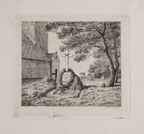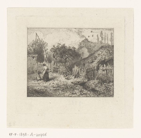 Otto Haslund created this print called "Fra Tryggerød" using etching. The scene, rendered in precise lines and varying densities of hatching, invites you into a quiet domestic space. Notice how Haslund uses line to delineate form and space. The texture of the thatched roof and wooden structures is captured through dense, intricate marks. These lines not only describe the physical attributes but also convey a sense of lived history and rustic simplicity. The composition leads the eye from the foreground, with its modest bucket, to the central figure hanging clothes, and further into the receding landscape. The organization of this image—the placement of each element—contributes to the narrative. Is this a deliberate composition or a candid snapshot? The image raises questions about the nature of representation. Ultimately, this etching is a testament to the power of formal elements to evoke a specific mood and cultural context.