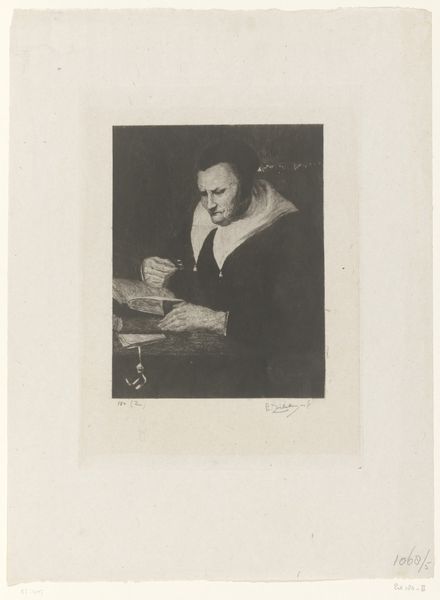 This print of an old woman reading, by Philip Zilcken, captivates with its masterful use of light and shadow, rendered through etching. The woman is positioned centrally, drawing our eye immediately to her focused gaze and delicate hands holding a magnifying glass. Zilcken's composition employs a somber palette, heightening the introspective mood. The texture, achieved through dense, fine lines, adds a tactile quality to the print, making the woman’s presence palpable. The formal arrangement emphasizes a moment of quiet contemplation. The work destabilizes conventional portraiture through its focus on the elderly and its emphasis on intellectual activity rather than beauty. Zilcken engages with semiotic codes through the book and spectacles which represent knowledge and reflection. These visual elements function within a larger discourse on the value of wisdom and experience challenging fixed societal values.