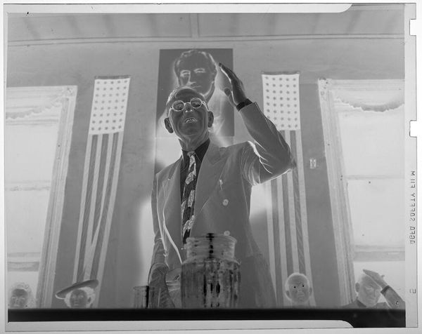 Curator: This gelatin silver print by Lester Cole features a man standing before a wall plastered with posters, an untitled work held at the Harvard Art Museums. Editor: It's striking how the negative space isolates the figure; he seems almost spectral against the chaotic backdrop of urgent wartime messaging. Curator: Indeed. The composition is a dialogue between order and disorder, the man in his immaculate suit a pillar of composure amidst the clamor. Note how the stark contrast highlights the textures of both the posters and his attire. Editor: The posters are such artifacts of a particular cultural moment—"Essential industry in peace or war!"—revealing anxieties and civic duties of that time. The man seems to embody the ideal citizen. Curator: The image's power lies in its formal simplicity. Cole manipulates light and shadow to create a dynamic yet balanced arrangement. Editor: It makes one think about how visual rhetoric shapes public opinion, how these symbols were intended to galvanize action. Curator: Precisely, and the photograph itself becomes part of that ongoing conversation. Editor: It's a fascinating collision of personal presentation and propagandistic messaging.