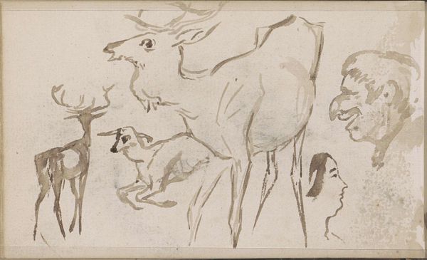 Editor: This drawing, "Studieblad, onder andere met paarden en honden," or "Study Sheet, Including Horses and Dogs" by Johannes Tavenraat, dates to 1839. It's done in pen and ink. It reminds me of a page torn from a sketchbook, full of energy. What do you see in this work? Curator: It's fascinating how Tavenraat uses animal forms—horses, dogs, even rabbits—to tap into a deeper vein of human experience. Think about the symbolism embedded in these creatures. The horse, traditionally, represents power, freedom, even nobility, while the dog symbolizes loyalty and companionship. What stories do these animals tell together? Editor: They seem to be in motion. The horses are running, the dog is alert. Maybe it's about the hunt? Curator: Perhaps. The hunt is a recurring motif, embodying both the primal drive for survival and a more cultivated pursuit associated with aristocracy. Notice, too, how the sketchy quality of the lines gives a sense of immediacy, as if Tavenraat is trying to capture a fleeting moment. Does that immediacy alter how you view the scene? Editor: I hadn't thought about it that way. I guess it feels less staged, more real, even though it's just a study. And the faces scattered around, are they symbolic as well? Curator: Absolutely. Though less defined, those faces remind us of humanity's presence, the observer and the orchestrator of this animal drama. They provide context, suggesting these aren't just animals in a field, but figures in a narrative. Editor: I see what you mean. The symbols really enrich the image. It's more than just a study; it's a cultural snapshot. Curator: Indeed. The drawing embodies a timeless dialogue between humans and the natural world, one reflected and refracted through the symbolic lens of art.