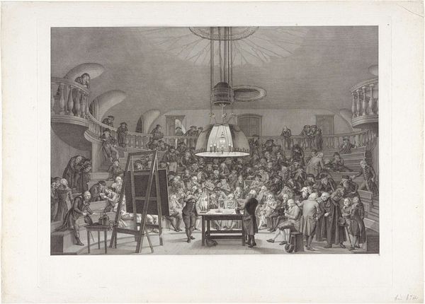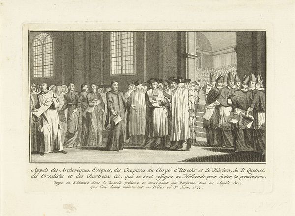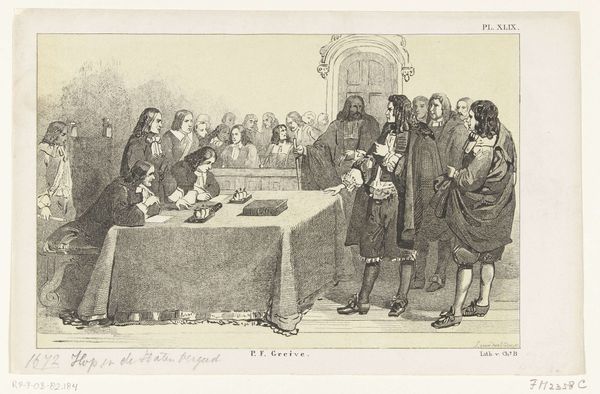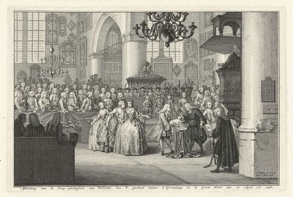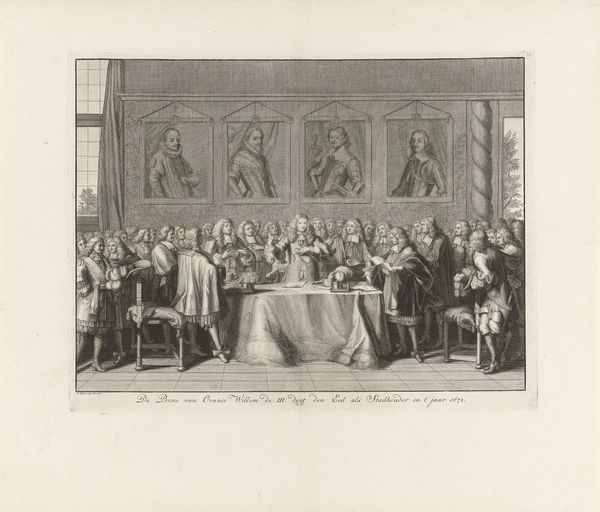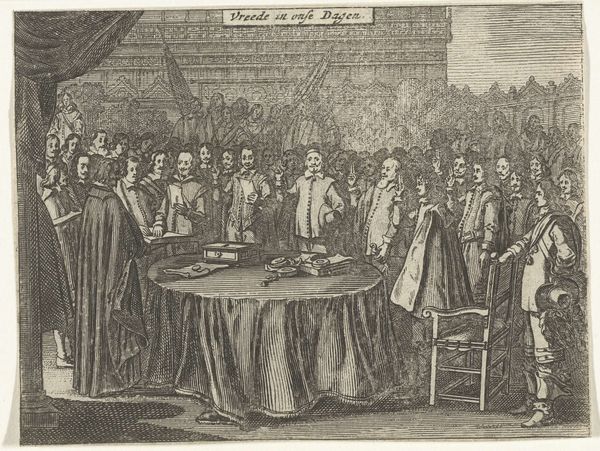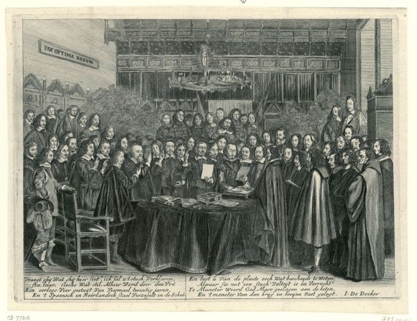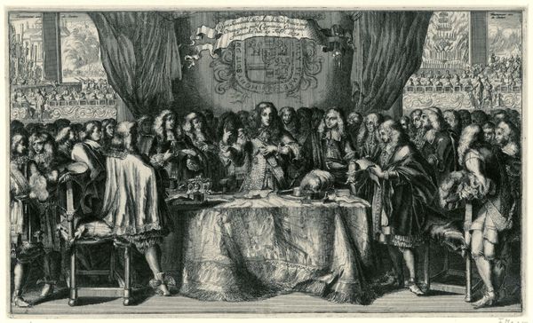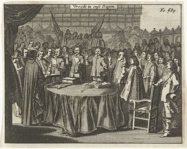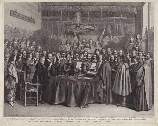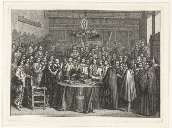 Editor: So, here we have Simon Fokke’s "Beëdiging van de Vrede van Munster, 1648," but created in 1754. It’s an engraving, depicting a historical moment. The mood is formal, very stiff. All these men, frozen in this... ceremonial tableau. What strikes you about it? Curator: As a materialist, I immediately consider the engraving process. Think about the labor involved. Each line etched meticulously into a metal plate, then reproduced in multiples. It flattens the historical event, turning it into a commodity for consumption. Consider also the division of labor inherent in printmaking during this era; Fokke likely collaborated with others to produce the engraving, so how much creative input did he actually have? What implications might this collaborative production process have had on the message the engraving conveys? Editor: That’s a great point, I didn't think about how much work goes into each print! Is that why prints were more commonplace then compared to paintings? Curator: Exactly. Prints democratized images, making them accessible to a wider audience. Think of the historical context: 1754, almost a century after the Peace of Munster. Why reproduce this particular event then? Who was the intended consumer, and what message were they meant to receive regarding the historical significance of the moment that the artwork attempts to portray? Editor: So it becomes less about the historical accuracy and more about the message being produced and distributed. Like propaganda? Curator: Not necessarily overt propaganda, but certainly a carefully constructed narrative, packaged for consumption. And we must consider who had access to it, and how this availability further solidified particular social structures and values. This isn't just a historical document; it’s a material object embedded in a complex web of social relations. Editor: This really changes how I see it. It’s less about the ‘art’ and more about the production and consumption of the image. Curator: Precisely. The "art" exists within that system, shaped by and contributing to it. Editor: Thank you for your insights. I definitely have a lot to reflect on after this experience. Curator: My pleasure. Materiality shapes meaning. Never forget that.