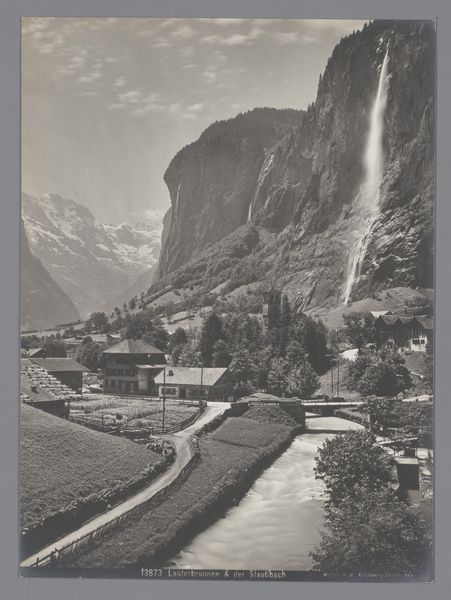Curator: Photochrom Zurich's "Gezicht op de Staubbachwaterval en de Jungfrau te Lauterbrunnen," dating from around 1896 or '97, is a scene of immense natural beauty. Editor: Immediately, I'm struck by how the photograph captures a hushed tranquility, that sort of silence that feels enormous, almost deafening, beneath those falls and mountain peaks. Curator: Precisely. And this wasn't just captured; it was manufactured. Photochrom prints were created by transferring a photographic negative onto multiple lithographic stones, each inked with a different color. Think about the layers of labor involved, from the initial photographer trekking through the landscape to the skilled lithographers adding color and depth by hand. Editor: You’re right. I guess I just initially saw it as this idealized version of a perfect little village, dwarfed by nature. A reminder of human fragility. But there’s also the mechanical, almost industrial process involved in creating something seemingly so serene. Curator: Consider that idyllic image further. These photochroms became wildly popular souvenirs. They fueled a burgeoning tourist industry eager to consume picturesque views. Mass production romanticizing nature - slightly ironic, wouldn’t you say? Editor: Definitely ironic, a commodity peddling an escape from commodities. Yet, these waterfalls are elemental, right? The sheer force is arresting. Curator: It's this intersection that fascinates me: how nature is captured, consumed, and transformed through labor and technology, becoming an object of both awe and economic exchange. It urges me to consider what "natural" means anymore, when nearly every inch has been mapped, marketed, or manipulated. Editor: And in an era grappling with ecological crises, it almost serves as a bittersweet reminder of the delicate balance. Beauty captured through industrial means. It really gets one thinking.