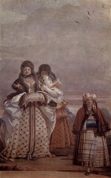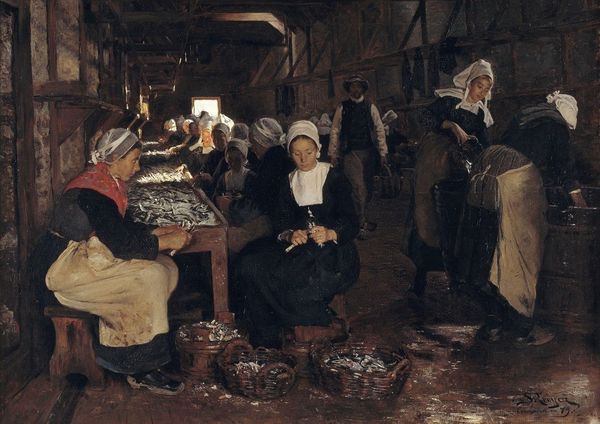 Curator: Here we have Andrei Ryabushkin’s "Sunday in the Village," an oil painting dating from 1892. It offers us a glimpse into Russian peasant life at the turn of the century. Editor: Oh, wow. It feels so unfinished and ghostly, almost dreamlike. Is it really complete? I’m drawn to the subdued palette...everything feels sun-bleached and faded, even those flashes of reds. Curator: Well, in some ways it *is* unfinished; notice the sketch-like quality, particularly toward the right of the composition. This piece offers a departure from strict realism and a move toward impressionistic sensibilities in Russia, focusing more on capturing the fleeting atmosphere of a moment. Ryabushkin explored historical and genre painting, revealing social dynamics and traditions of the era. Editor: So it’s not *supposed* to be a perfect, photographic record. It is lovely to contemplate their possible narratives here on their break... Curator: Exactly. The clothing gives some historical insights into social hierarchy but it should also prompt the viewer to reflect on these women's role in preserving and shaping cultural heritage. And these elements underscore his connection to a larger trend in Russian art seeking a more distinctly national identity, as distinct from the perceived domination of Western influences. Editor: I get a real sense of communal identity in that too, even a silent understanding. I also feel a touch of melancholic nostalgia—like remembering a childhood I never had. The painting is not just showing something; it *feels* like something. It stirs emotions in you, wouldn't you agree? Curator: I would say it also provides a rich socio-political statement on a particular Russian identity. But beyond his statement about identity, there's something innately human being explored in Ryabushkin's canvas too. It has a haunting quality. Editor: It really does. A brief meditation on fleeting memories on an afternoon. Something worth holding onto. Curator: Indeed. And perhaps what the painting lacks in literal finish, it gains in expressive power about historical preservation, collective experience, and the enduring spirit of rural life in the face of enormous historical changes.