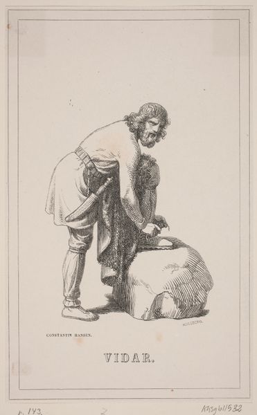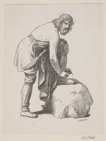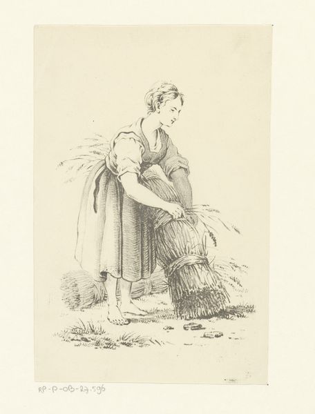 Editor: Here we have "Houtklover," which I believe translates to "Wood Chopper," by Cornelis Steffelaar, dating somewhere between 1807 and 1861. It's a pencil drawing, seemingly depicting a peasant engaged in labor. What do you make of this genre scene? Curator: Well, immediately, it strikes me as a window into the social consciousness of the time. Consider the burgeoning Realist movement, which aimed to depict everyday life, particularly of the working class, without romanticism. The artist isn't glorifying labor; instead, they’re presenting a scene of commonplace, manual work. How does the depiction of labor here compare with other artworks you've seen from this era? Editor: I suppose it's more down-to-earth. There’s a sense of authenticity to it, perhaps in the way the figure’s clothes are rendered, or the plainness of his tools. There’s no embellishment, no heroic stance. Curator: Precisely. Think about the audience for art during this period. Genre paintings like this provided glimpses into lives and social classes often overlooked or idealized by academic painting. Do you think images like this played a role in shaping social perceptions or even fostering empathy for the working class? Editor: I think it certainly humanizes labor. Showing the dignity of everyday work to people who would probably never have had to do it themselves. Curator: Exactly. And think about where such a work might be displayed – perhaps not in the grandest salons, but in smaller galleries or even private collections, gradually influencing the prevailing artistic and social tastes. Ultimately Steffelaar and his contemporaries are widening the audience for art while drawing our eye to all layers of the society. Editor: It's interesting to think of a drawing of something seemingly so simple having that sort of social impact! Thank you.
