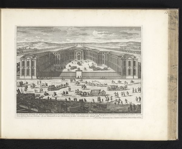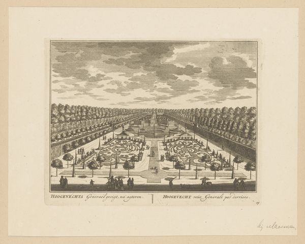 Curator: This is Daniël Stopendaal's 1719 engraving, "View of the Garden of the Zijdebalen Estate on the Vecht near Utrecht," currently housed here at the Rijksmuseum. Editor: My first impression is one of controlled opulence. The stark lines of the architecture contrast with the organic shapes of the carefully manicured greenery, creating a palpable tension. Curator: Exactly. Notice how the engraving technique—the meticulous cross-hatching—defines the baroque aesthetic. The lines direct the eye through the rigid symmetry. Each formal element communicates social power through rational order. Editor: Let’s also consider the material and context. As a print, this image would have been reproducible, circulating ideas about landscape and status among a broader elite. The labor involved in creating and distributing the print, both skilled artistry and commercial infrastructure, highlights its social function beyond mere decoration. Curator: And yet, beyond mere social record, this print demonstrates a self-referential awareness of perspective—how the architectonic is made subservient to the vanishing point of perspectival schemes. Note the balance created via light and shade. How each plane works towards a total effect of...order. Editor: Order that’s inherently constructed. Think of the materials—the paper, the ink, the metal plate used to produce this image. The whole point hinges upon this interplay. By studying Stopendaal’s material engagement we see the garden transformed from lived space to representational object, imbued with cultural value. Curator: Agreed, the semiotics involved is crucial to interpreting the intention here. This artwork makes one appreciate form while it depicts forms... I feel compelled to linger! Editor: I concur. Analyzing its materiality provides access into the systems and intentions shaping the depicted view and by understanding the social systems, a clearer appreciation for its original context develops. Thank you.