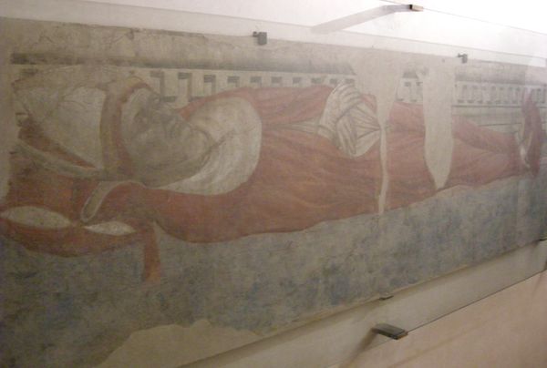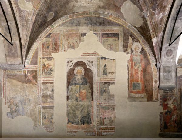 Editor: This is a fresco from the Tomb of Judgement, dating back to 200 BC, found in Ancient Mieza, Greece. The artwork presents two figures, Aeacus and Rhadamanthys. The weathered state of the fresco evokes a sense of history and the passage of time, almost as though peering into the distant past. What does this particular scene communicate to you? Curator: What strikes me is the public nature of justice in ancient Greece, even after death. This wasn't a private, divine decision. It was visualized, made accessible, within a tomb, yes, but also for viewing, commemorating. The artist’s rendering would influence popular understandings of the afterlife, reinforcing social norms. Do you notice how the figures are rendered? Editor: Yes, Aeacus is seated and appears to be wearing a crown. Rhadamanthys is standing. Both figures are draped. I wonder about the intended effect. Curator: That’s precisely what is so revealing about the social function of the art! Aeacus and Rhadamanthys were believed to judge the souls of the dead. Rendering them in such a stately manner, within a painted architectural space, gave earthly authority to those who dictated what happened in the afterlife. How do you see that power playing out in their depiction? Editor: Their posture and regalia project authority, but I'm also struck by how faded the colors are. Perhaps originally the colours would emphasize their grandeur. Curator: Exactly! The monumentality wouldn't just exist within their depictions, but bleed into the tomb and even into society through social interpretation. That makes one ponder how public images contribute to upholding various forms of authority, not only in art but throughout history. Editor: That is truly interesting, this image works on both social and art historical levels! Now I wonder what else can frescoes reveal!