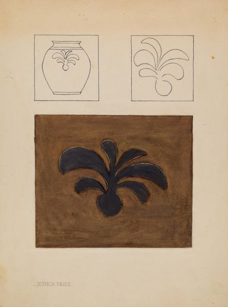 Editor: This is Yolande Delasser’s “Crock,” from around 1937, a drawing on paper rendered with pencil and watercolor. I find the composition really interesting – a preliminary sketch above and then the finished study below. What do you see in this piece? Curator: I see a conversation about vessels, both the literal ceramic crock and the organic forms contained within, even evoked on its surface. Vessels are rich in cultural memory, aren’t they? Holding not just substance, but symbolic weight. Editor: How so? I mean, it just looks like a drawing of a plant to me. Curator: Consider the symbolism of the vessel across cultures – the womb, the container of life, of potential. And the plant form? It’s not just a decorative motif, but a signifier of growth, resilience, the cyclical nature of existence. Doesn’t that deepens our understanding of the object depicted? Editor: Definitely, it’s making me rethink how I look at simple, everyday objects. The artist almost seems to be layering meaning through simple shapes. Curator: Precisely. Even the medium contributes – the ephemeral nature of watercolor, suggestive of fragility, impermanence, set against the presumed solidity of the ceramic. Do you think that Delasser chose the media because she liked the watercolor aesthetic or she considered the implications of choosing it? Editor: I hadn't thought about it, but now that you mention it, probably both. The delicate color enhances that sense of fragility you mentioned, doesn't it? This really makes you think about how much meaning can be embedded in something that appears so simple. Curator: It is deceptively simple. Consider also the artist's own positioning – is this a botanical study? An exercise in design? Or a personal reflection on the enduring power of nature and human creation? It encapsulates all those meanings simultaneously. Editor: It's amazing how a seemingly straightforward drawing can reveal so much about cultural ideas and the artist's viewpoint. I’ll never look at a plant the same way.