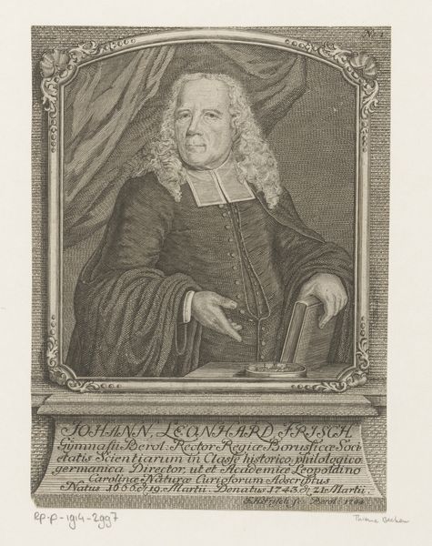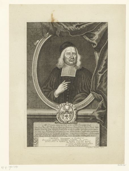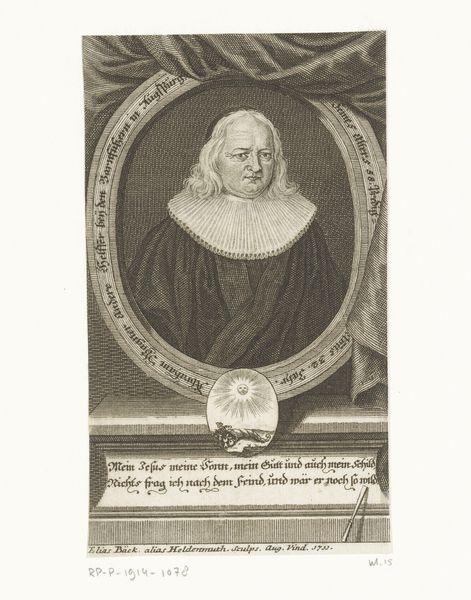 This is Johann August Corvinus's etched portrait of Johannes Tulla, likely created around 1731. Note the stark contrast, where the subject's face emerges from a densely detailed background of text and symbolic ornamentation. The circular frame around Tulla's head creates an immediate focal point, drawing our attention to his composed expression. The use of oval shapes throughout the composition—in the frame and the inscription below—serves to unify the disparate elements. The artist masterfully employs line and texture to convey a sense of depth and dimension, particularly in the rendering of Tulla's ruffled collar and flowing hair. The text surrounding the portrait isn't merely decorative. It integrates theological context that emphasizes ideas of faith and redemption. The placement of these words around Tulla suggests the weight of religious authority. The formal structure of the piece—the calculated arrangement of text, image, and ornamentation—functions to situate Tulla within a complex web of meaning.