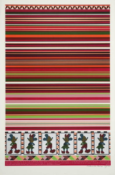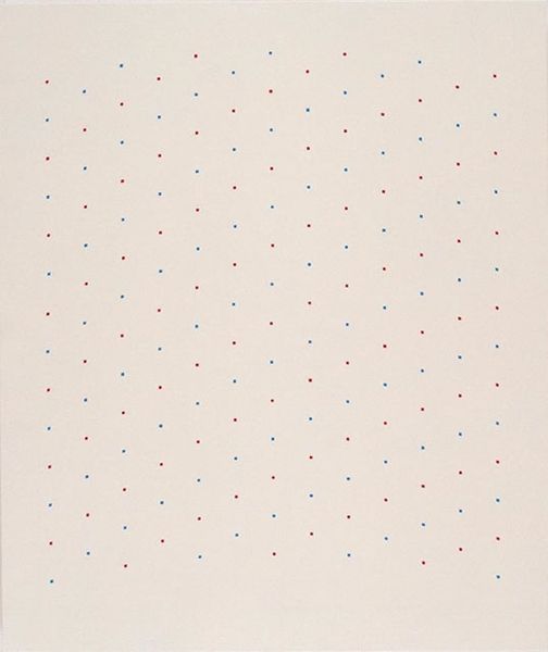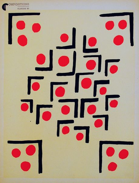 Curator: Brian Clarke's "Time Lag Zero" presents a fascinating arrangement of geometric forms, part of the Tate collection. It's undated, which adds a layer of intrigue, don't you think? Editor: Immediately, I'm struck by its almost digital, coded feel. The carefully placed squares and dots evoke a sense of ordered information, like a vintage computer printout. Curator: Absolutely. Clarke’s exploration of geometric abstraction in the late 20th century reflects the growing influence of computerization on society and art. Editor: The choice of colors is interesting too. The limited palette of red, pink, gold, and black against the creamy paper gives a somewhat unsettling feeling. Curator: The visual language is rooted in earlier movements, but Clarke reinterprets them through a contemporary lens. These patterns could be seen as a commentary on the increasing digitalization of visual culture. Editor: It also feels very musical to me. The arrangement of shapes could be seen as a visual score. I wonder what feelings that evokes for today's audience. Curator: The work offers a glimpse into the anxieties and excitements surrounding new technologies, even as it engages with historical artistic traditions. Editor: It is amazing how the simplest shapes can trigger so many cultural associations. I’m left pondering its message.