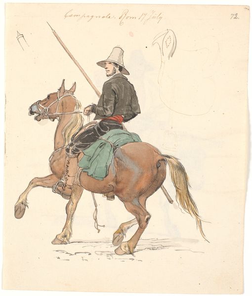 Editor: So this drawing, "A whipper-in on horseback" by Johannes Vinkeles, at the Städel Museum… it's executed in pencil, ink, and chalk. There’s a real focus on the form, on the muscularity of the horse. What strikes you about it? Curator: I notice the materials first. The starkness of pencil, ink, and chalk; these accessible, almost utilitarian materials, used to depict someone clearly within a social hierarchy. This tells me a lot about the accessibility, or lack thereof, when it comes to the access and the ownership of art production. Do you think Vinkeles made this piece for himself, or as a commission? Editor: That's interesting, I hadn't thought about the commissioning aspect. Given the title "Whipper-in," it makes me wonder if it was commissioned to depict this profession within fox hunting, perhaps showing their control, almost ownership, of the natural landscape and labor that came with that world. Curator: Exactly. Consider also the production process itself. Drawing with pencil, chalk and ink suggests preparatory work. This wasn’t meant to be a finished grand artwork, but more of a working document. The labour that comes with creating something that celebrates… labor. Editor: It’s interesting to consider this as part of the “academic art” style, because the materials make it feel very… grounded. Was it meant to be elevated into a higher art? Curator: Well, that’s the crucial question, isn't it? Is this sketch 'less than' because of the simplicity of materials, or do those materials actually give it a unique power, a rawness that challenges what "high art" can even be? It forces us to really analyze the artist's labour, and in some sense the horse and the whipper-in's labor as well, right? Editor: I'm definitely looking at this differently now, understanding that even material choice makes an artistic statement in itself, revealing societal positions on class and artistic labor. Curator: Precisely! Recognizing art not only for its aesthetic qualities, but for what it reveals about society and production.
