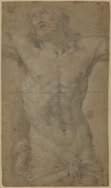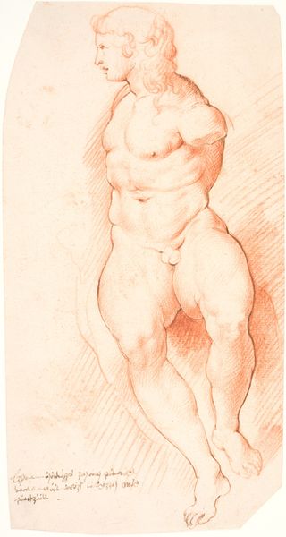 Editor: Here we have "Male Model Study, Standing, with Raised Arm" made sometime between 1671 and 1738 by Hendrik Krock. It’s a pencil drawing, quite large. I’m struck by how dynamic it feels despite the limited color palette. How do you interpret the composition of this piece? Curator: The most arresting aspect is undoubtedly the interplay of line and form. Note the strategic use of hatching to define the musculature, imbuing the figure with a sense of depth and volume. The raised arm, of course, creates a diagonal thrust that enlivens the entire composition. Editor: It almost feels like a preparatory sketch. Is there something to that, do you think? Curator: Indeed, we can view this drawing as an exercise in form. Krock appears primarily concerned with capturing the nuances of human anatomy through precise draftsmanship. Observe how each line contributes to the overall structure, carefully delineating planes and suggesting three-dimensionality on a two-dimensional surface. Consider the subtle shift in the pressure of the pencil as it defines the curvature of the calf or the flex of the bicep. Editor: So, the focus is really on the internal relationships of the work itself, rather than, say, the model's identity? Curator: Precisely. The "what" and "who" take a backseat to the "how." The work presents us with a self-contained system of visual elements, inviting us to appreciate its internal coherence and structural integrity, regardless of the subject. What did you make of his stance? Editor: It does create a sense of motion and weight distribution. Thank you. That has really helped me understand Krock's artistic intentions in this drawing. Curator: And you've sharpened my own understanding of its immediate, physical impact. A rewarding exchange, wouldn't you agree?
