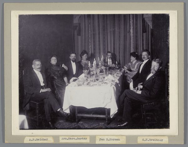 Nicolaas Schuitvlot made this photograph of what we think is a student society at dinner, but we don't know when. It’s a scene caught in sepia tones, where the marks aren't made by brushstrokes, but by light itself, a chemical reaction. I’m drawn to the textures here: the sheen of the chandelier, the crisp white tablecloth, and the faces of the men, some blurred into soft focus, others sharp. Look at the man in the center, holding a plate above his head. Is he about to drop it? The image asks questions but doesn't give any definite answers, and I enjoy that ambiguity. The photographic process makes the faces so real. Photographs like this one always remind me of paintings. Maybe because they capture a moment in time, or because they are both about representation. The artist could have chosen to crop tighter or looser, giving us a different feel for the image. The history of art is a conversation, an ongoing experiment, and photographs such as this one remind us of the many possibilities.