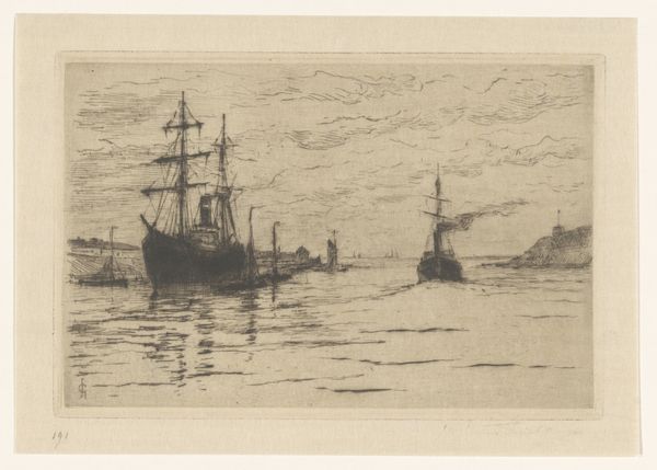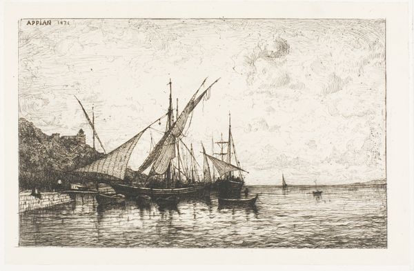 Charles A. Platt created this etching titled, "Fishing Boats" sometime between the late 19th and early 20th centuries. Platt, an American artist, provides us with a window into a maritime world, where labor and leisure intersect on the open water. The fishing boats aren't just objects; they're a stage for the lives of those who depend on the sea. Look closely and you can imagine the sailors, their livelihoods tied to the daily catch, their identities shaped by the rhythms of the ocean. The composition is subtle. Platt gives emphasis to the boats closest to the viewer, while other boats can be seen further afield. This suggests a community, one that invokes the shared experience of working the sea, where the labor of fishing is both a personal and a collective endeavor. Platt’s "Fishing Boats" reflects the spirit of its time, inviting us to consider the relationship between labor, leisure, and the sea.