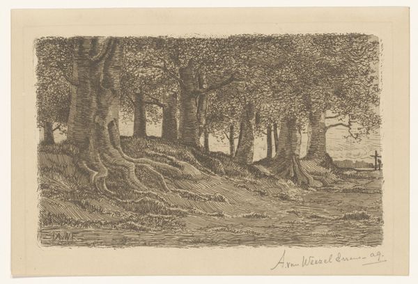 Adolphe van Weezel Errens created this evocative landscape with farmhouses using etching techniques. The composition is anchored by the trees, framing a humble rural dwelling. The trees, with their reaching branches, may symbolize growth and connection, yet also, when bare, hint at mortality and the passage of time. Consider the archetype of the tree, the axis mundi, a symbol reaching back to ancient cultures, linking the earthly and spiritual realms. We see its echoes in the World Tree of Norse mythology, Yggdrasil, or the Tree of Life, ubiquitous in countless cultures. Here, the artist touches on our deep-seated, perhaps subconscious, connection to nature. The image evokes a feeling of nostalgia, a longing for simpler times. The trees, the farmhouse, the well—they are more than just objects; they are vessels of memory, resonating with a collective human experience of rural life. This is not merely a depiction of a landscape, but a powerful, cyclical reminder of our connection to the land.
