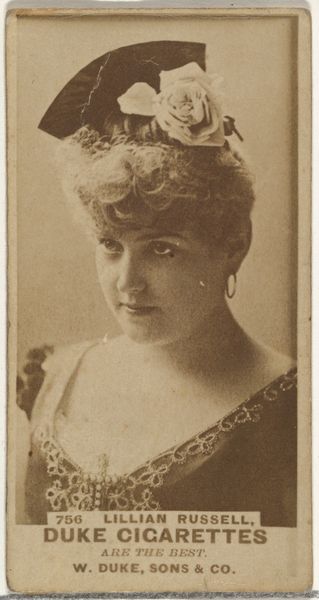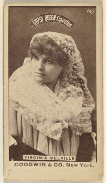 This is Card Number 70, Louise Pauline, from the Actors and Actresses series, created by W. Duke, Sons & Co., part of a set issued to promote Cameo Cigarettes. The monochromatic palette focuses attention on the texture and form within this small rectangle. Notice how the soft focus renders Louise Pauline’s features with a gentle, almost ethereal quality, characteristic of photographic portraiture of the period. The composition, dominated by her face and upper body, is carefully arranged. The dark dress creates a stark contrast against her fair skin, drawing the eye upwards. The lace and floral arrangement soften this contrast, adding visual interest. This card functions as both an aesthetic object and a promotional tool. It engages with the semiotic system where beauty, celebrity, and consumerism intersect. The card presents an actress as a desirable figure and the cigarette brand with sophistication and glamour. The interplay between the actress's image and the product promotes a lifestyle of leisure and aspiration. This tension embodies the complexities inherent in the commodification of art.