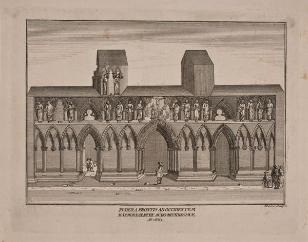 Wenceslaus Hollar created this print of the Tomb of Henry VII in 1677 for Francis Sandford’s "Genealogical History of the Kings of England." The composition immediately strikes us with its relentless detail and rigid symmetry. Hollar uses etching to create a dense, almost overwhelming visual texture. Note how the linear precision emphasizes the tomb's architectural elements, from the pointed arches to the statues. The print invites us to think about the relationship between representation and power. The tomb, a symbol of royal authority, is meticulously rendered, yet the flatness of the print medium somewhat undermines its imposing presence. This tension destabilizes the very notion of permanence and grandeur that the monument seeks to embody. The work reflects the broader seventeenth-century preoccupation with order and classification. The etching’s lines and geometric forms mirror the era’s drive to codify knowledge. Hollar's print becomes not just a depiction but also an interpretation of power through form. The meaning here arises from the intricate interplay between the subject and its formal representation.