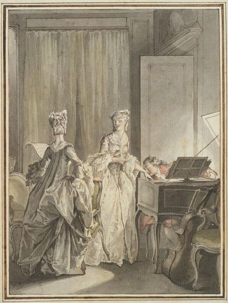 Editor: This painting, titled "Lady at her Toilette" by Pietro Longhi, captures a very intimate scene. What immediately grabs my attention is the artist's handling of light and shadow, it almost feels theatrical. How do you interpret this work from a formal perspective? Curator: The arrangement of elements orchestrates our gaze. Notice how Longhi positions the central figure slightly off-center, creating a visual tension that draws us into the narrative. The composition guides our attention from the miniature dog in the foreground to the lady, then up through the standing figures and finally resting momentarily on the picture hanging above and behind. How does that compositional technique strike you? Editor: I see what you mean. The way he uses line and form creates an upward momentum. Even the folds of the red fabric draw your eye upwards. And I see what seems to be the light illuminating all three figures as well as the picture up above. But, what about the painting’s surface and paint application itself? Curator: Observe Longhi’s technique in the rendering of the textures. Note the differences in the handling of fabrics – from the smoothness of the lady’s dress to the rougher surface of the red material offered by the second maid. What might that differentiation tell us? Editor: I suppose the textures provide an interesting contrast to the eye. It adds to the sense of realism that Longhi creates, perhaps giving clues about what it felt like to be in such a space and time? The contrast is heightened by the lighting of the red robe vs the central figures’ lighter tone as well. Curator: Precisely. These subtle juxtapositions serve not just to mimic reality, but to draw attention to the painting's constructed nature. Editor: It's fascinating how a focus on formal elements reveals so much about the painting’s meaning and artistry! Thank you! Curator: My pleasure. And note the visual harmony as you move to your next work.