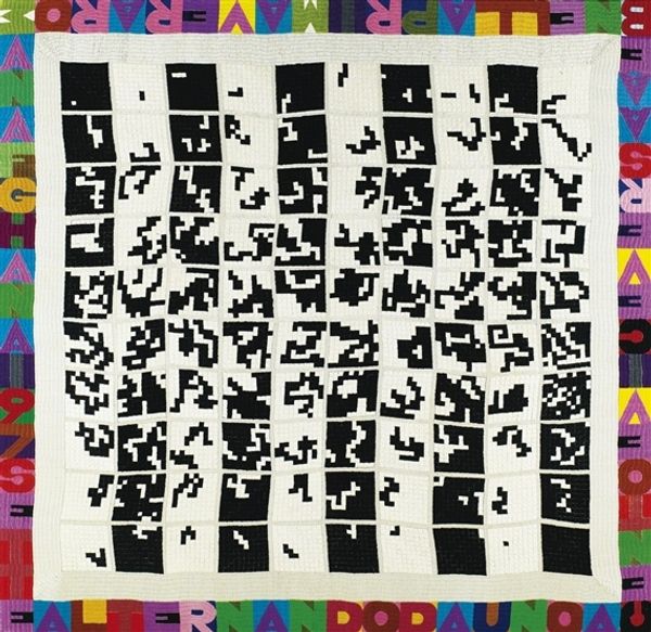 Natalia Dumitresco made this painting, titled "Tout á la joie," using oil on canvas. The bright, bold colors and simple, blocky forms may seem playful, but there's a deeper consideration of process at work here. Dumitresco has created a dense pattern of small squares, each containing what appears to be abstract symbols. These miniature compositions are contained within larger rectangles of color. The repetition suggests a system, maybe even a code, and invites us to consider the act of making as a kind of labor. Each square likely involved a similar set of actions: mixing paint, applying it to the canvas, and defining the image. Dumitresco's method encourages us to think about the relationship between individual effort and larger structures, echoing the repetitive processes often found in industrial production. By focusing on the act of creation itself, the artist pushes us to reconsider the value we place on labor and its relationship to art. It’s a great example of how the material processes and the social context become essential to understanding an artwork's full meaning.