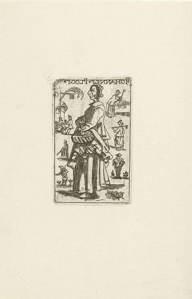 This is "Marskramer", an etching by Claes Jansz van der Hout. The eye is immediately drawn to the figure of a travelling merchant, rendered in a style of expressive brevity. The composition, though simple, reveals a sophisticated understanding of form. Lines create definition, but they also evoke the texture of the figure’s garments, contrasting with the smooth areas of the plate. The artist masterfully manipulates the etching technique to create depth. The dense network of lines to the left of the image, indicating shadow and adding a certain weight to the composition, draws the eye into the scene. Van der Hout seems to be engaging in a conversation about the act of seeing, and perhaps the way in which the eye and hand work together to capture a fleeting image, a semiotic language of representation. The scene suggests a moment of transition or movement, an oblique commentary on the nature of visual perception itself.