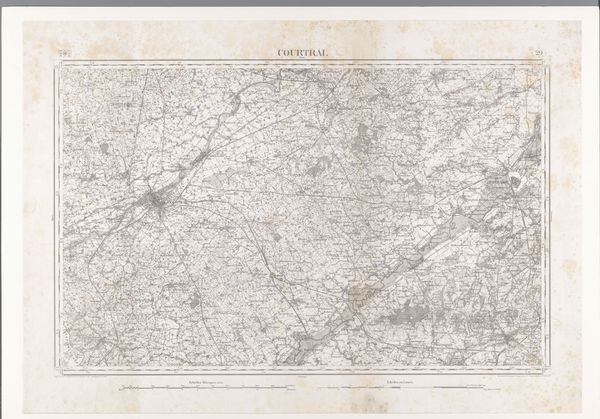 Editor: So, this is an etching from 1871, "Kaart van het gebied ten noorden van Nijvel," a map of the area north of Nivelles. It's on aged paper, naturally, with delicate lines. I find it calming, almost nostalgic, in a way that modern maps aren't. What do you see in this piece? Curator: I see layers of cultural memory embedded in those delicate lines. Maps aren't just geographical tools, they're reflections of power, ownership, and how we perceive our place in the world. Look at the subtle way the landscape is rendered—how does it evoke a sense of territory, control? Editor: Well, there's definitely a sense of order, almost a clinical precision in the depiction of roads and boundaries. It's very geometric, dividing the land. Curator: Exactly. That geometric division speaks volumes. Consider what the act of mapping signifies. Who commissions these maps? Who benefits from this kind of ordered representation? Think of the layers of psychological weight this kind of representation would carry for different people, especially regarding land ownership and control at that time. What is being emphasized, and consequently, what is being omitted or minimized? Editor: That's fascinating. I hadn't considered the psychological impact in such a direct way. I was focused on the aesthetic of it, but now I see the implicit message about power and structure. It is no longer as calm. Curator: Indeed. Maps can tell powerful, if unspoken, narratives. It's in examining those choices – the inclusion and exclusion, the emphasis and the omission – that the true meaning emerges. It highlights how simple drawings reveal more than meets the eye. Editor: Thanks for sharing, I think I'll look at maps a little differently from now on, recognizing them as a lens into power dynamics. Curator: My pleasure! I think recognizing how art can impact how one experiences psychological impact is something we all should reflect on.