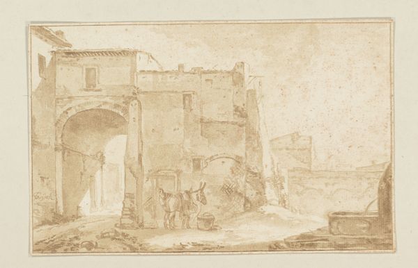 Curator: Carl Morgenstern's "Straßenzug in Marina Grande auf Capri," likely from 1835, greets us. It’s housed here at the Städel Museum. A lovely pencil and pen sketch. Editor: It’s immediately striking for its airiness. The delicate lines give it a very dreamlike, almost faded quality. The architecture is beautiful but seems very… unpopulated, and the mountain fades into the background. Curator: Yes, that ethereal quality is key. Morgenstern, working within the Romantic tradition, presents us not just with a place, but with a feeling. Think about the political climate of the 1830s. Travel was increasingly accessible, fostering this interest in the ‘picturesque’ and ‘untouched’ locales like Capri. But, even then, places change due to industrial demands of the new urban subject in need of escape to less urban locations to rejuvenate. Editor: Absolutely. I am drawn to the meticulous detail despite its looseness. Look at how the pencil creates depth in the arches, how the sun beats on stone. It feels incredibly tactile and embodied labor. Curator: Good point. But consider how the composition reinforces ideas about Italy's place in the European imagination. The idealized view of Capri removed of the working class, is carefully curated, reflecting a Northern European, especially a German, audience’s desires. This idyllic Mediterranean location represents freedom and escape for his patrons that has long existed only to fade in time Editor: That makes me wonder about the actual process of drawing and etching at the time; what pencils did Morgenstern use to produce those thin consistent lines to appeal the wealthy middle class? Where they made locally, or bought to be delivered, possibly Italian produced tools? Even art production leaves marks! Curator: It is truly remarkable how he conveys that atmosphere of faded grandeur and a vision to capitalize tourism. The drawing functions almost as a souvenir even before mass tourism truly takes hold and displaces it own culture. Editor: Precisely. Looking closely at his artistic practice shows so much to see—more than first meets the eye. Curator: A fascinating dialogue between place, artistic skill, and broader cultural forces then that gives a look on art industry today as well. Editor: Absolutely, making it such a relevant, and beautiful, piece even now.