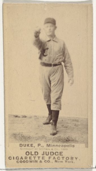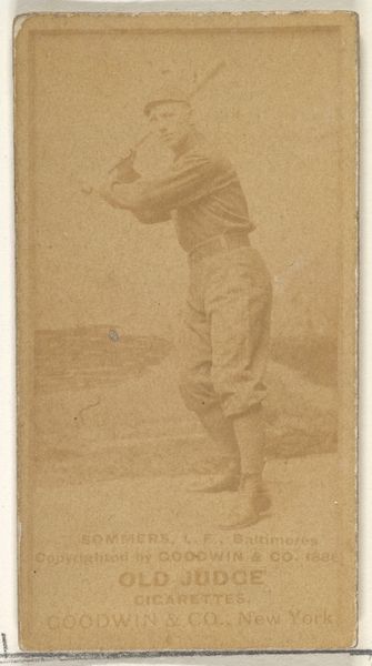 This small photograph of William Theodore "Billy" Crowell, made around 1887 by Goodwin & Company, presents us with a study in tonal harmony. The sepia tones create a warm yet muted effect, casting a nostalgic lens on the early days of baseball. The composition is straightforward: Crowell, the pitcher, stands poised, caught in a moment of potential action. The texture of the card itself, aged and worn, adds another layer of depth. We can see this is an object intended for mass consumption, designed for a fleeting engagement. It served as a collectible inserted in cigarette packs. The photograph has taken on a new cultural significance. It transcends its original commercial purpose to become a valuable artifact, prompting reflections on consumption, representation, and the enduring appeal of a bygone era.