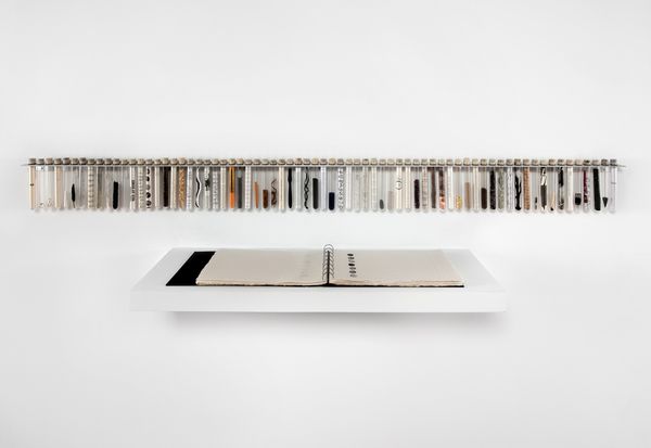 Curator: The Ann Hamilton piece we're observing, titled "Untitled (Book Ball)," dates from 1994 and involves a rather striking use of mixed media, principally books and what appears to be a large ball of string, all carefully placed within a glass-covered structure. Editor: There's an almost melancholy stillness about this presentation. The muted palette of white, cream, and grey against the dark frame creates a powerful contrast, lending an air of preciousness, or perhaps, of objects remembered. The book frozen in mid-read... Curator: Yes, and consider the tension between the geometric clarity of the vitrine and the organic forms held within. The crisp lines and angles against the chaotic roundness of the thread and open book evoke a kind of controlled disorder. What do you make of this relationship? Editor: I read this pairing, and especially the presentation method, as Hamilton grappling with the institutions and historical forces that influence cultural understanding and memory. The book, vulnerable and yet presented with archival reverence in the vitrine, perhaps symbolizes a need to protect but also to interrogate how knowledge is presented. It's no coincidence it’s called a book "ball", books become history's building blocks. Curator: Intriguing. One could also interpret the “ball” itself as an embodiment of accumulated narratives, the woven threads representing diverse perspectives coalescing into a singular mass. It reflects on Hamilton's recurrent exploration of materiality and texture as avenues for expressing meaning. Editor: And this specific format certainly emphasizes the commodification of knowledge. What is gained, what is lost by sealing up art? Is this a statement on cultural institutions preserving books, the written word, or the limitations inherent within? Curator: A poignant question to ponder as we consider Hamilton's "Untitled (Book Ball)." It compels us to acknowledge the intricacies inherent in our connection to literature, archives, and artistic forms. Editor: Indeed, Hamilton’s work creates a space of both containment and infinite possibility. One feels the echo of many possible stories quietly vibrating from within that glass box.