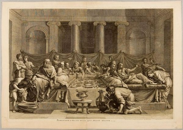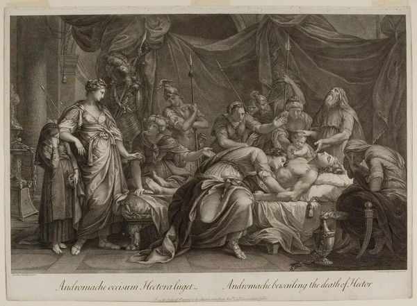 Curator: This engraving, "Haman Arrested by Order of Ahasuerus," was created by Jacques Firmin Beauvarlet, who lived from 1731 to 1797. Editor: It’s a tense scene; the whole composition feels theatrical, and yet frozen in time. The contrast between light and shadow really heightens the drama. Curator: Indeed. Beauvarlet was working within a tradition that emphasized moralizing narratives, often drawn from scripture or classical history, as a way to instruct the public in proper conduct and the consequences of tyranny. Editor: You see that play out so clearly. Haman's downfall is a powerful visual statement against unchecked power, and its impact is amplified by Esther’s central position of power. Curator: Right, and it also reflects the evolving role of women in public discourse, particularly within courtly settings. Editor: It's a fascinating insight into the social and political dynamics of the period. It makes you consider the role of art in shaping public opinion. Curator: Absolutely. The way that this artwork frames the relationship between power, justice, and public perception offers much to consider. Editor: It does, and it prompts us to think about those ongoing struggles that resonate even today.