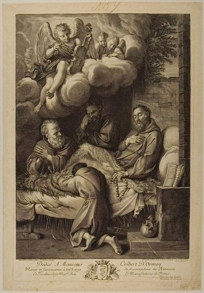 Curator: The stark contrast between light and shadow gives this print, François Chauveau's "Descent from the Cross", a dramatic flair. Look at the material reality of the scene, the timber, the cloth, the very tools of labor cast aside... Editor: Yes, and what a powerful, politically charged depiction of grief and sacrifice. The expressions alone convey centuries of oppression and resilience! Curator: The etching technique allows for such intricate detail, the way Chauveau conveys texture, the woven shroud, the rough-hewn cross. It shows the artistic labor and expertise in printmaking. Editor: Absolutely. And think about this imagery circulating— consider the social implications, the message of redemption broadcast to a wide audience, reinforcing dominant power structures, but also offering solace to the marginalized. Curator: These little cherubs at the base… their playful interaction with what seems to be the crown of thorns. It is really fascinating to see the interplay between innocence and suffering rendered in ink on paper. Editor: I'm struck by how the body of Christ is rendered so vulnerable, a clear commentary on power dynamics. Curator: A lot to unpack, really, for a single print. Editor: Indeed. This visual narrative resonates deeply across time.