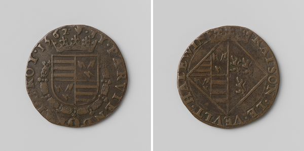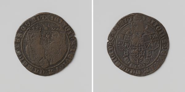 Editor: Here we have "Filips II, koning van Spanje, rekenpenning van het bureau van de koning," a carved metal piece dating back to 1551. It strikes me as incredibly detailed for such a small object. What do you make of it? Curator: It's fascinating to consider this as a product of labour. Someone meticulously carved these tiny details, presumably for the King's bureau. The material, likely a base metal, speaks to broader issues of currency and control, right? Editor: That makes sense. How does its function as a "rekenpenning" -- a counting token -- influence our understanding? Curator: Absolutely! It forces us to look beyond its aesthetic value. This isn't just a portrait, but a tool of commerce and administration. Who had access to these tokens? What sort of calculations were being made? These questions shift the focus to the systems of power and labor embedded in its use. What impact did this labor have on the economy of the time? Editor: I see, so it's less about the King's image and more about the material and social context surrounding its production and use. Curator: Precisely. Think of the mining of the metal, the artisan’s skill, and the function it serves within the economic system of the time. Editor: I never thought about it that way! This has given me a totally different perspective to examine works of art from that era. Curator: Exactly! By focusing on the materiality and function, we gain access to different kinds of understanding. It is amazing how much one learns from looking at objects and examining them from production all the way to their consumption.