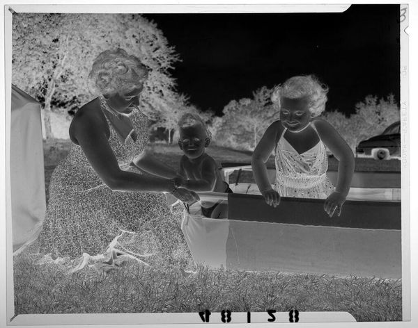 Editor: Here we have an untitled photograph of a bride standing outside a car, taken by Lucian and Mary Brown. The high contrast gives it an otherworldly feel. What symbols stand out to you in this image? Curator: The inverted tones make the familiar strange. The bride, a potent symbol of hope and new beginnings, is rendered in ghostly whites and greys. Even the car, a symbol of mobility and freedom, feels weighty, almost tomb-like. Editor: Tomb-like? That's a strong word. Curator: Consider the cultural weight of marriage – the death of the individual and the birth of the couple. Do you see any of that tension in the image? Editor: I hadn't thought of it that way, but now I do! It adds a layer of complexity I didn't see at first. Curator: Visual symbols are rarely straightforward; they carry echoes of history and personal meaning.