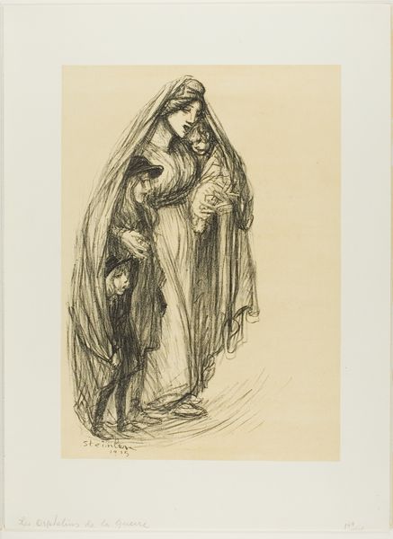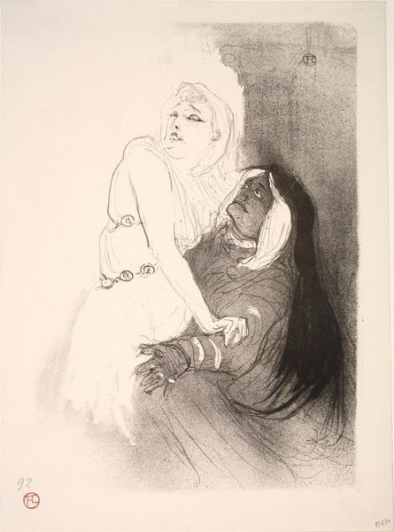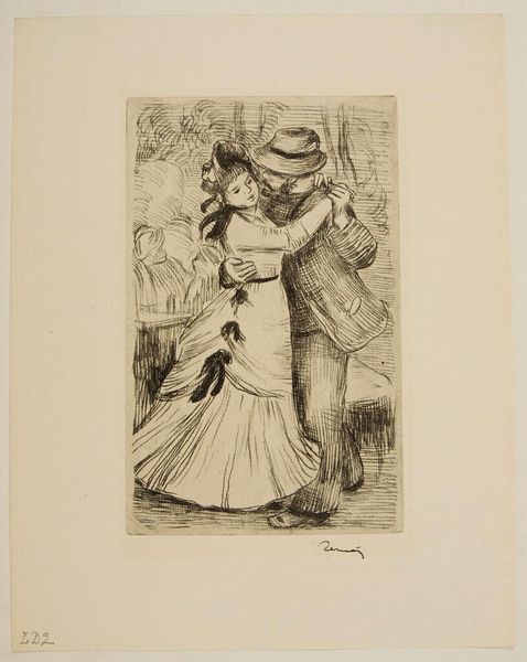 Curator: Let's take a look at "Espagnoles," by Luis Jou, currently residing in the Harvard Art Museums. What's your initial read? Editor: Well, I'm immediately struck by the almost overwhelming floral detail on their dresses. It's like they're emerging from a garden, a very stylized, graphic garden. Curator: Indeed. This print reflects an interest in Spanish culture, a common theme in early 20th-century European art. The woodcut technique lends itself well to the bold lines and patterns. Editor: It feels like an illustration plucked from the pages of a fairy tale, doesn't it? There's a formality in their posture, yet their eyes hint at something secretive, maybe even mischievous. Curator: The positioning and the graphic style certainly tap into the romanticized, and sometimes exoticized, view of Spain. It evokes a sense of mystery and charm that was popular in that era's artistic circles. Editor: For me, there's something both alluring and slightly unsettling about it. It invites you closer, but those dark, unwavering gazes keep you at a distance. Curator: I agree. Jou has crafted a visually striking piece, and it showcases how cultural fascination can be both inspiring and complex. Editor: It's a reminder that beauty can be found in the most unexpected places and that, sometimes, art is all about embracing the unknown.