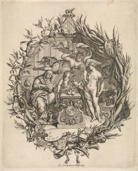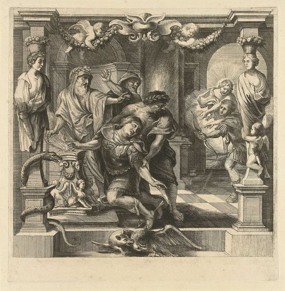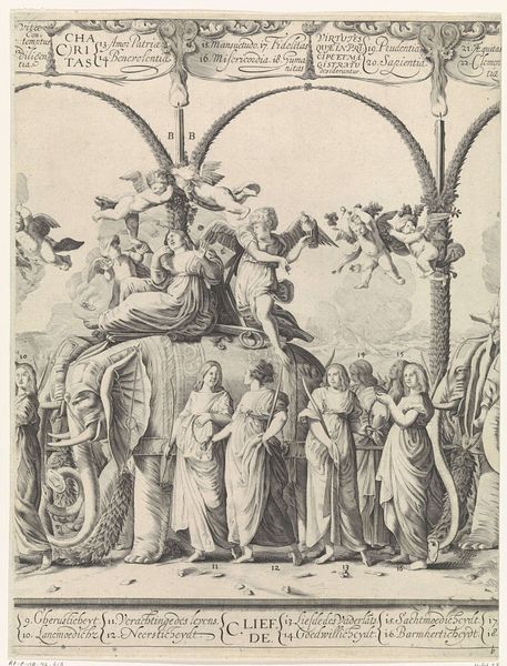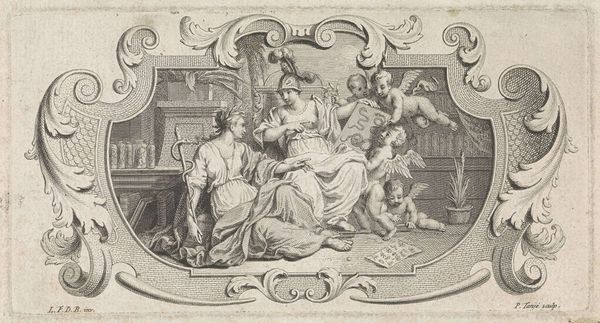 Curator: Franz Ertinger's 1679 engraving, "Thetis receives arms for Achilles from Vulcan" presents a bustling scene, a mythological tableau brought to life with Baroque flair. My first thought is just how much is going on. So much detail, but so meticulously rendered! Editor: It feels almost claustrophobic, doesn’t it? There's this density, an active foreground that almost smothers the narrative. Ertinger definitely captures the drama of the divine exchange but I do wonder about the symbolic impact. Curator: Well, the scene itself is rife with symbolism, isn't it? We see Thetis, the sea nymph, receiving the armor for her son Achilles from Vulcan, the god of the forge. Achilles, of course, is fated to die in the Trojan War, making this moment loaded with a bittersweet tension. The figures surrounding them underscore the historical and mythical heft of it all. Editor: Exactly, and I think positioning this artwork in its cultural and political setting is important. Seventeenth-century art was, after all, enmeshed with power dynamics. Allegorical engravings like this, commissioned and circulated, perpetuated particular heroic ideals and visions of leadership. It is fascinating how Ertinger visualizes this exchange, but the power structure that commissions this work does, indeed, require our critical attention. Curator: I think the engraving style certainly amplifies this. Ertinger used line work to suggest tone, mass and, volume. If you look carefully, he captures the opulence of the scene while alluding to its grave implications through the use of heavy Baroque themes. The fact that we see putti flying overhead reminds me of what lies ahead. Editor: Yet there is more at play here. I notice that Ertinger depicts Thetis at the center; but how is she framed by these narratives of war and fate that mostly focus on men and their glories? How are such classical stories utilized to subtly reinforce patriarchy, making even mothers like Thetis seem almost props in masculine plots? I always find something very poignant, for instance, in knowing that these objects are housed in the Rijksmuseum, formerly representing Dutch colonial aspirations. Curator: I appreciate how you consider what a museum embodies; how these artifacts come to mean different things when a once sovereign state turns to a colonial power. As historians, we consider these trajectories in the production and consumption of these images, their historical context, their impact, the narrative that still drives them to this day. Editor: Yes! By grappling with this intersectional discourse, we come closer to seeing Ertinger’s beautiful image—and, crucially, beyond its most immediate scope, as we draw conclusions between power and portrayal.