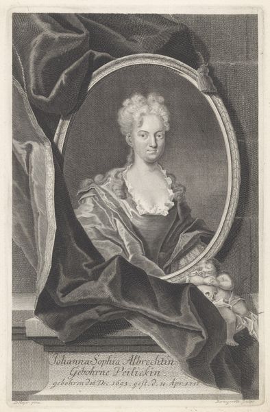 Daniel Chodowiecki created this portrait of Wilhelmina van Pruisen using etching, a printmaking technique that democratized image production in the 18th century. Unlike painting, which remained the province of elite artists, etching allowed for relatively quick and inexpensive reproduction. An etcher covers a metal plate with a waxy ground, then draws through it with a needle to expose the metal. The plate is then immersed in acid, which bites into the exposed lines, creating grooves that hold ink. The deeper the bite, the darker the line when printed. The fine, controlled lines showcase Chodowiecki’s skill in capturing the details of Wilhelmina's elaborate hairstyle and the delicate fabric of her dress. Etching facilitated the widespread circulation of images, catering to a growing market for portraits and other visual materials, connecting artistic production to broader social and economic trends. Looking at this print, it's important to remember that its meaning is as much about the process that made it as the person it depicts. The rise of printmaking blurs the lines between art, craft, and industry.