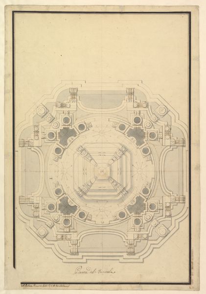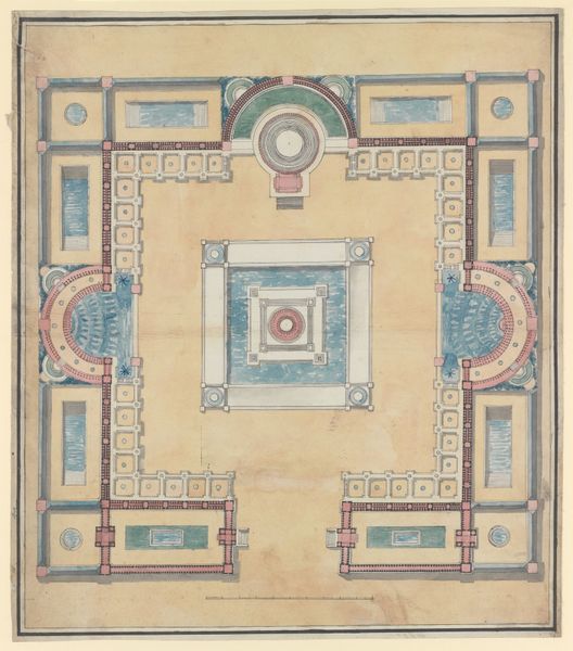 Editor: Here we have Jules-Edmond-Charles Lachaise’s "Partial design for ceiling decorated in Chinese motifs," likely created sometime between 1830 and 1897. It's a drawing and print made with watercolor on paper. I’m really intrigued by how the European artist interpreted what he considered 'Chinese' design. What resonates with you when you look at it? Curator: I'm immediately drawn to how the artist merges European aesthetics with perceived Chinese motifs. The geometric framework suggests order, a very Western artistic value. But then the floral patterns attempt to emulate Eastern designs. It is almost as if the artist uses pattern to define the unknown and make it familiar. Don't you think the geometric nature flattens what may be seen as more chaotic "Eastern" visual systems? Editor: Yes, that tension is striking. The imposed grid attempts to categorize, but the asymmetrical placement of the floral details feels like a resistance to that rigid order. It also speaks to the Western gaze, perhaps unintentionally highlighting a superficial understanding of the original culture. What could be said of this superficial understanding based on that single flower and the "oriental" grid that supports it? Curator: Indeed, and look at how these supposed Chinese decorations were chosen for a ceiling—a space that historically symbolizes the heavens, knowledge, and enlightenment. To adorn it with a Western fantasy of the ‘Orient’ says much about cultural projection and the exoticism prevalent during that era. Does the application of it to a ceiling change your idea of its intention? Editor: That context definitely shifts my perspective. It becomes a symbol of Western appropriation, a desire to control and define other cultures. The cultural memory that is produced is one defined through a biased lens. Curator: Exactly. These decorative patterns hold layered meanings, beyond their aesthetic appeal, reminding us to be mindful of the historical context and power dynamics embedded within seemingly harmless designs. Editor: It’s fascinating how a seemingly simple decorative piece reveals such complexity. Thank you for unveiling that hidden history and those dynamics within. Curator: My pleasure! Visual symbols are such rich testaments of our past. They provide us with continuous opportunities to discover things about our culture.