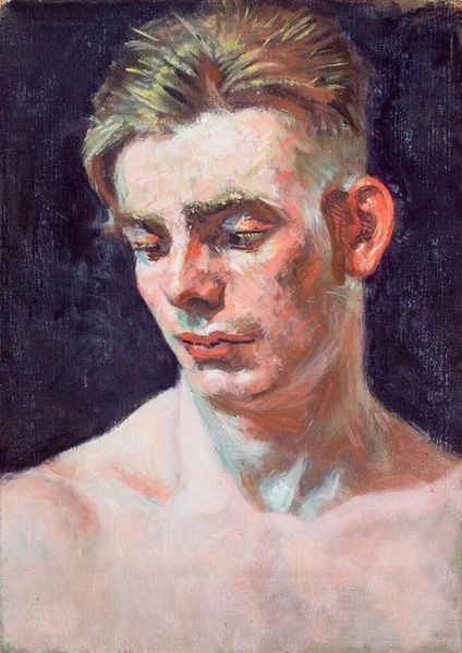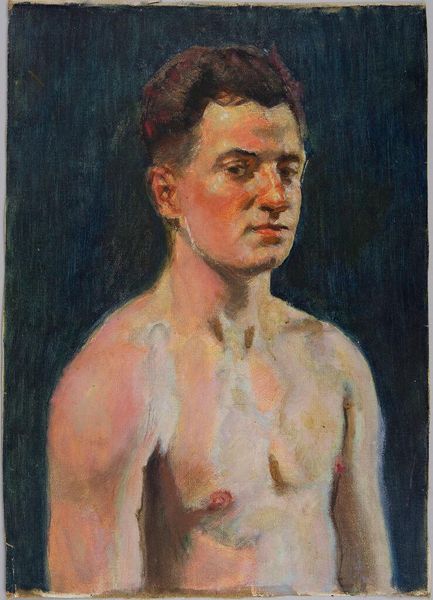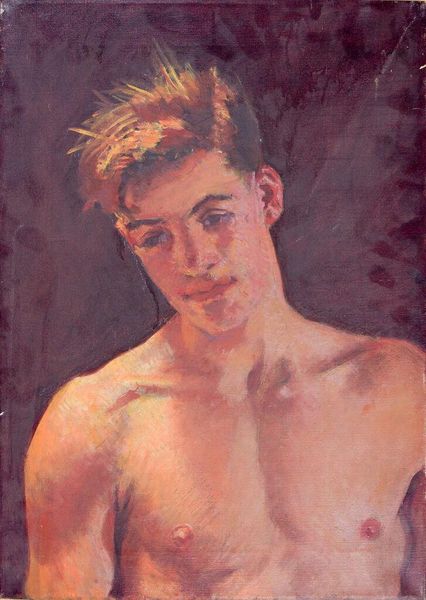 Curator: Denman Waldo Ross gifted us this oil on canvas, called *Portrait of a Shirtless Young Man*. Editor: It's interesting, isn't it? There's a kind of raw innocence to it, like a sketch caught between classical ideals and something more personal. The visible brushstrokes hint at an intriguing labor process. Curator: Ross was deeply interested in color theory and design. It might be more about exploring light and form, using the male figure as a vehicle for that experimentation. Editor: Perhaps, but the choice of a shirtless subject has to mean something, even back then. Was it about representing the ideal worker, the laborer stripped bare, or something else? What class does he belong to? Curator: Or maybe it's just a study of the human form, a way to capture the ephemeral quality of youth. Who knows what the artist was thinking... he takes that with him. Editor: Well, I think it’s also about what the viewer brings to it. The materials whisper stories about labor, commerce, and maybe even desire. Makes you wonder. Curator: Yes! And that's the beauty of it. It’s like a mirror reflecting our own thoughts and questions. Editor: A mirror made of canvas, oil, and the artist's hand... Food for thought.