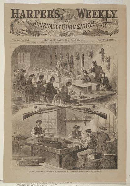 Winslow Homer made this illustration, "Thanksgiving Day - The Dinner" in 1858 for Harper's Weekly, using wood engraving on paper. The composition is divided into two distinct scenes, each framed within the larger page. In the upper panel, a formal dinner is depicted. The horizontal lines of the tables and the vertical lines of the figures create a structured, almost rigid setting. The contrast between light and shadow defines forms and adds depth. This structured arrangement speaks to the ritualized nature of dining. Below, the scene shifts dramatically. Figures are caught in dynamic poses as they dance. The lines here are curved and energetic, conveying movement. The use of chiaroscuro enhances the sense of liveliness and spontaneity. The shift from the structured meal to the fluid dance reflects a transition from formal duty to unrestrained enjoyment. Homer uses this visual dichotomy to explore themes of social order and individual expression. Together, the composition invites viewers to reflect on the structured and unstructured experiences that shape our lives.