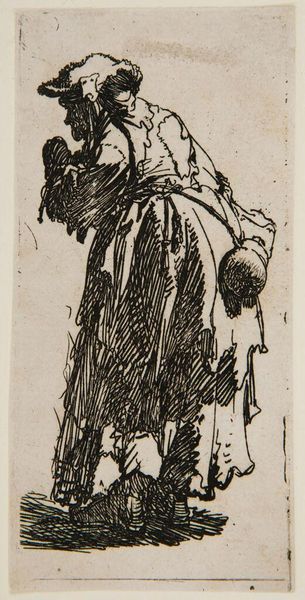 Editor: This is Jacques Callot's "Beggar on Crutches, Wearing Cap," made with etching. The lines are so detailed, showing tattered clothes and a worn figure. What does this etching reveal to you? Curator: It showcases Callot's mastery of the etching process, transforming readily available materials into commentary on the socio-economic conditions of his time. The printmaking enabled wider circulation of these images, which were critical of wealth distribution and its consequences. Editor: So, the *process* of creating the print allowed it to be a tool for social commentary? Curator: Precisely! The materials, the technique, and distribution all played a part in shaping its meaning and impact. It highlights not just the subject, but the societal structures that allowed such poverty to persist. Editor: I hadn't considered the materials and production as part of the message itself. Thanks for pointing that out!