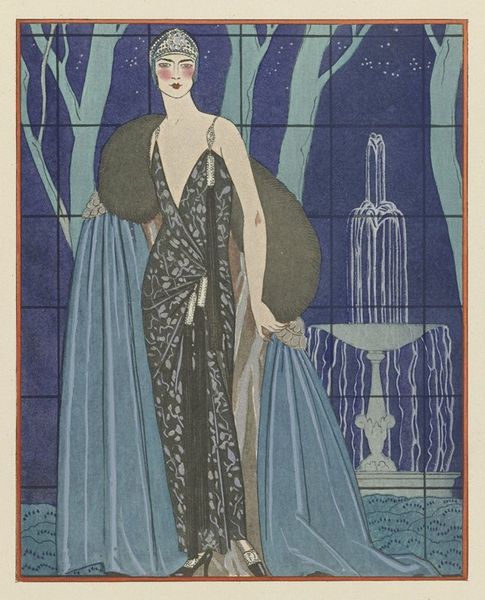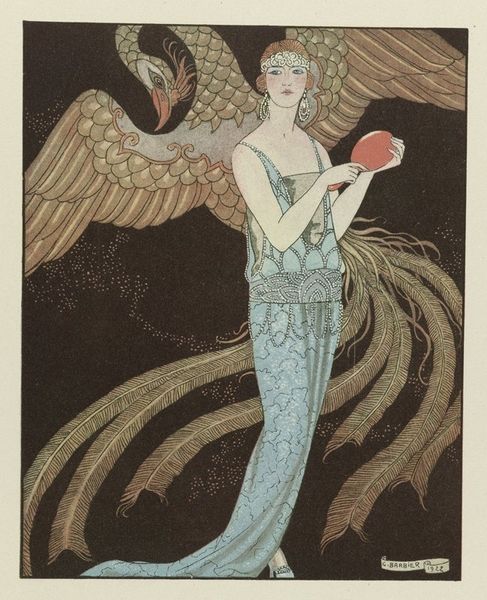 George Barbier made this pochoir print of a Worth evening gown sometime in the early 20th century, and the flat planes of color and strong outlines give it a real graphic punch. The mark-making here is so clean, so precise – it's all about control, not letting the hand get too wobbly. Look at the way the black dress just sits there, a big, dark shape in the middle of the composition, softened by the splash of violet at the waist and hem. And the background, a dreamy, almost surreal landscape of purple feathers and golden birds, flattened against a brick-red sky. There’s a tension between the flatness of the print and the depth it hints at with the overlapping forms. The way Barbier balances these elements reminds me a bit of Erté, who was working around the same time. Both artists were masters of Art Deco style, using bold lines and rich colors to create these really glamorous, idealized images. It's all about the surface, but with a knowing wink, suggesting there's more to it than meets the eye.