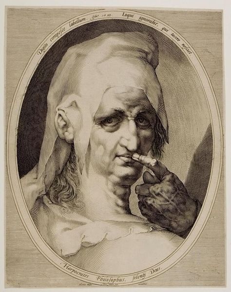 Curator: Looking at this, the first thing that strikes me is how intimate yet unnerving it feels. It's as if we're intruding on a deeply personal moment, maybe even a secret. Editor: I see that too. This print, made around 1593 by Jan Muller, captures Harpocrates, the God of Silence, but it presents an interesting tension. Muller made this engraving using drawing principles typical of Mannerism, which emphasizes the artificial, even exaggerated human form. The figure is idealized, yet his hooded face expresses vulnerability. It speaks to something much deeper, the deliberate withholding and complex internal states. Curator: It’s certainly intriguing that Harpocrates, the god associated with silence, is being presented during a period where religious and political discourses were heavily policed. His placement in an artistic movement championing artificiality further complicates my feelings toward this artwork. Editor: Let’s focus on the engraving technique itself. Muller masterfully uses line variations to model the forms. See how the lines around the eyes and mouth are much finer, creating a sense of realism in these key areas. And there’s an incredible contrast in textures between the smoothness of his face and the rougher lines defining the hand and drapery. Curator: I think what's really compelling here is the challenge the artist sets before us. Is this about outward repression, that the finger must forcefully restrain words, or is it also suggestive of an interior meditation? How the choice to print such images impacted society requires consideration. The print becomes a sort of commentary on communication and authority in late 16th century Europe. Editor: Absolutely, and I'd say the interplay of light and shadow adds to the artwork's introspective mood, guiding the viewer’s eyes. There is a powerful use of oval format framing and strong focus on a person in order to draw attention and isolate it within the picture plane. Curator: Exploring “Harpocrates, the God of Silence”, with you reminds us about considering a society’s rules for acceptable expressions as they change throughout history. Thanks for shedding light on this interesting piece with me! Editor: Indeed, together we found something unique, and this look into technique, symbolism, and the social role of imagery has broadened our views today.